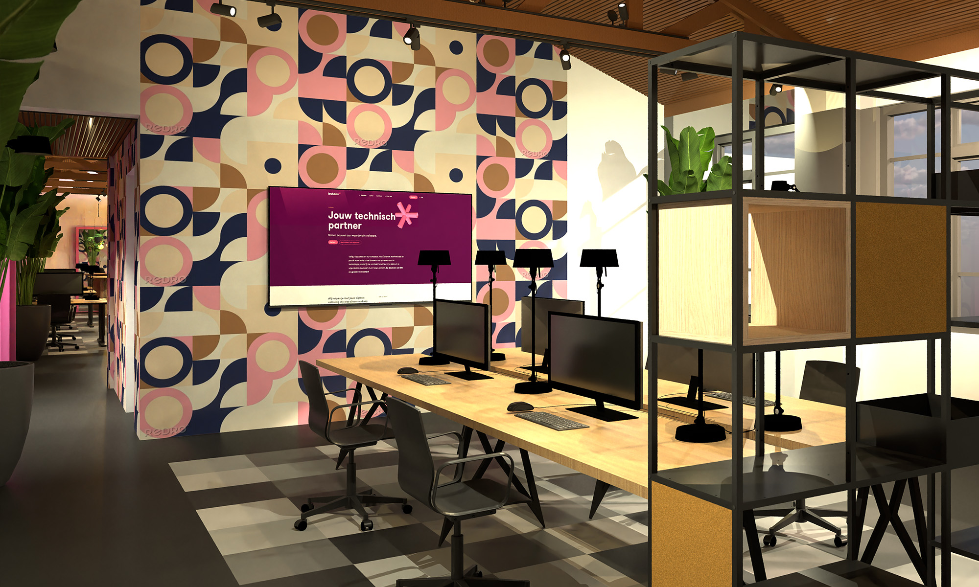 De locatie bevindt zich in de voormalige Pastoe-fabriek, een industrieel stuk rijk erfgoed. Historische elementen zijn niet weggepoetst, maar als onderdeel geïntegreerd. Het originele zwart gewolkte marmoleum is behouden als tastbare herinnering aan het verleden. Dit is gecombineerd met zwart-wit vloertegels als knipoog naar een bitmapstructuur, een directe verwijzing naar het dagelijkse werkveld van LeukeLeu. Om de akoestiek te optimaliseren én warmte toe te voegen, is gekozen voor een houten WoodUpp-plafond dat de bestaande structuur versterkt en het ruimtegevoel verfijnt. Tonone-wandverlichting zorgt voor een zachte, warme lichtlaag en benadrukt het ritme van de architectonische basis, waardoor de ruimte rust en samenhang krijgt. Het resultaat is een gelaagde werkomgeving waarin ruimte, materiaal en licht samen een omgeving vormen die menselijk aanvoelt, uitnodigt tot gebruik en hun waarden ondersteund.