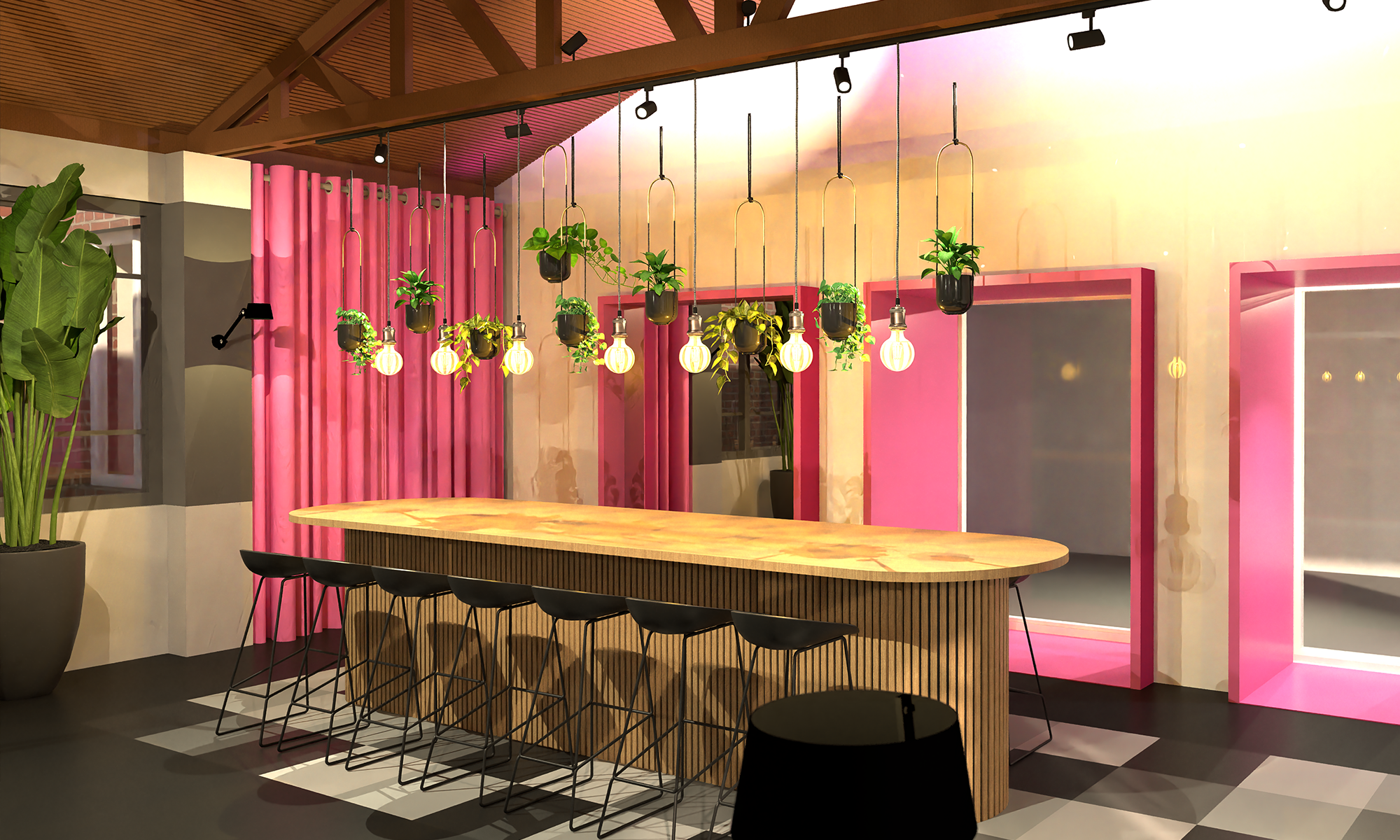 Bij binnenkomst staat een grote tafel op hoogte, plek voor een tete a tete en voor de gezamelijke lunch. Het hart van de kantoorruimte wordt gevormd door een centrale leestafel, een plek voor overleg en samenwerking. Rondom deze kern zijn werkeilanden georganiseerd, met daarachter, als coulissen achter theatergordijnen, de meer besloten concentratieplekken. Zo ontstaat een duidelijke maar vloeiende overgang tussen openheid en focus. Als eyechatcher op de achterwand is een podium geplaatst die flexibel inzetbaar is: voor het opnemen van podcasts, presentaties of als informele game- en ontspanningsplek. De tweede kantoorruimte is een stiltewerkplek en het achterste kantoor is voorzien van een hoge tafel met videoconferencing, ingericht voor de wekelijkse digitale kick-off. Door functies te stapelen zijn compacte, slimme en creatieve oplossingen ontstaan die het gebruik stimuleren en verrassen.