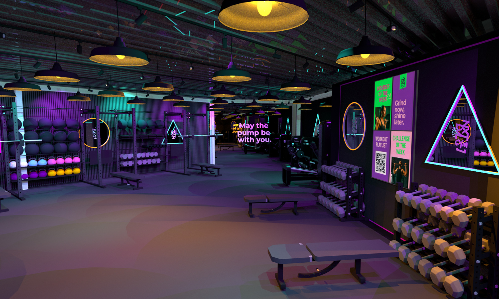 Verlichting speelt een centrale rol in het ontwerp. Boven de trainingsvloer hangen industriële barnlampen in een repeterend grid die dimbaar zijn. In combinatie met trackrails en armaturen, waarvan de lichtkleur aangepast kan worden, biedt dit flexibiliteit in sfeer en intensiteit.